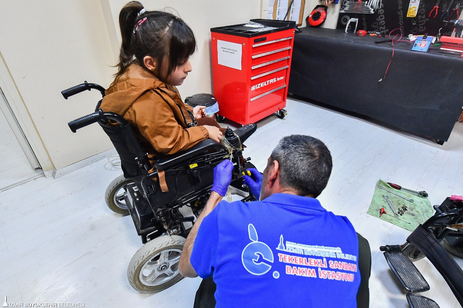 Engelli bireylerin sosyal yaşama engelsiz katılımı yolunda sayısız hizmeti hayata geçiren İzmir Büyükşehir Belediyesi, arızalanan tekerlekli sandalyeleri de tamir ediyor. Konak Center’da faaliyet gösteren Tekerlekli Sandalye Bakım ve Onarım Atölyesi, yolda kalan engelli bireylerin imdadına yetişiyor. Günde 10 aracın tamir ve bakımının yapıldığı atölye ücretsiz hizmet veriyor. Araçlar, engelli bireylerin evlerinden ya da arızanın yaşandığı yerden alınıyor, tamir edildikten sonra teslim ediliyor.