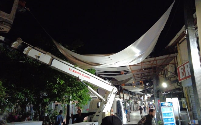 Bornova Belediyesi Fen İşleri Müdürlüğü'ne bağlı ekipler, yoğun bir yaya trafiğine sahip olan Tarihi Büyük Çarşı'daki çalışmaları, gece geç saatlerde başlatarak, sabaha kadar direklerin sökümünü tamamladı. Yağmurlu havalarda üzerinde su biriktirerek yağışsız anlarda dahi yürüyenlerin ıslanmasına neden olabilen brandaların da kaldırılmasıyla Büyük Çarşı'nın tarihi yapısı ön plana çıktı.