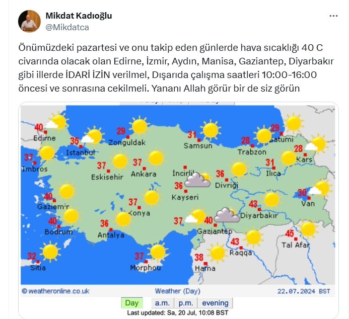 "Önümüzdeki pazartesi ve onu takip eden günlerde hava sıcaklığı 40 C civarında olacak olan Edirne, İzmir, Aydın, Manisa, Gaziantep, Diyarbakır gibi illerde idari izin verilmeli, Dışarıda çalışma saatleri 10:00-16:00 öncesi ve sonrasına çekilmeli. Yananı Allah görür bir de siz görün."