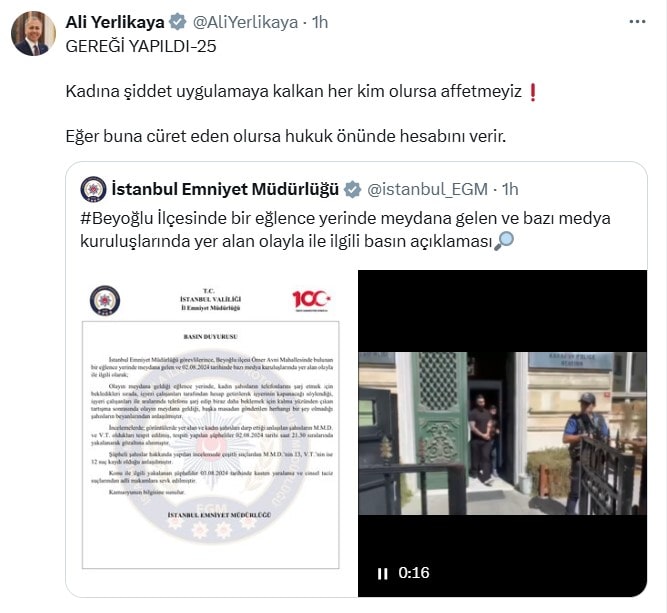 İçişleri Bakanı Ali Yerlikaya, sosyal medya hesabından yaptığı açıklamada, "Kadına şiddet uygulamaya kalkan her kim olursa affetmeyiz! Eğer buna cüret eden olursa hukuk önünde hesabını verir" dedi.