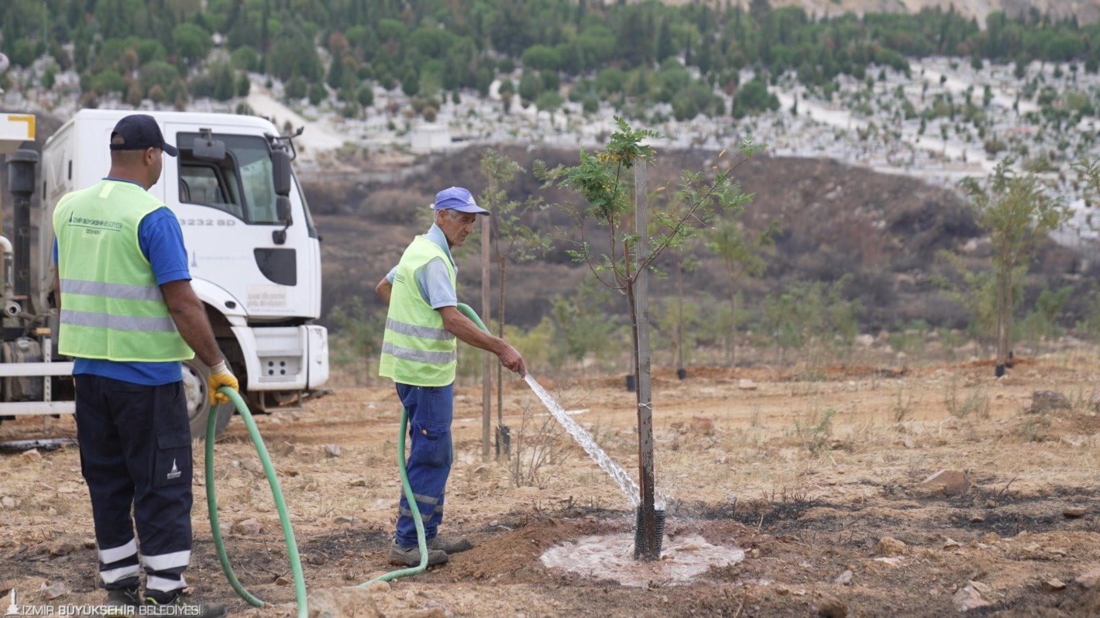 Çalışmalar hakkında bilgi veren İzmir Büyükşehir Belediyesi Park ve Bahçeler Dairesi Başkanlığı’nda görevli Ağaçlandırma Şefi Fuat Karaca, “İçinde bulunduğumuz alan İzmir Büyükşehir Belediyemize ait ağaçlandırma sahasıdır. 16 ağustos günü çıkan büyük orman yangınında bizim sahamız da bu yangından etkilendi. Ağaçlarımızın yaprakları tamamen kavruldu. Cemil Başkanımızın talimatıyla sahada hızlı bir şekilde ağaçları bakıma aldık. Havaların soğumasıyla gövdedeki su sürgünleri kesiliyor. Kuru dallar da daha sonraki süreçte kesilecek. Sahamız şu anda yüzde 90 oranında yeşillendi. İnşallah bundan sonra böyle büyük yangınlar yaşamayız. Biz bu yeşil alanları görmeye devam ederiz. Böylece İzmir’in dağlarını çiçekler açtırmaya İzmir Büyükşehir Belediyesi olarak devam edeceğiz” ifadelerini kullandı.