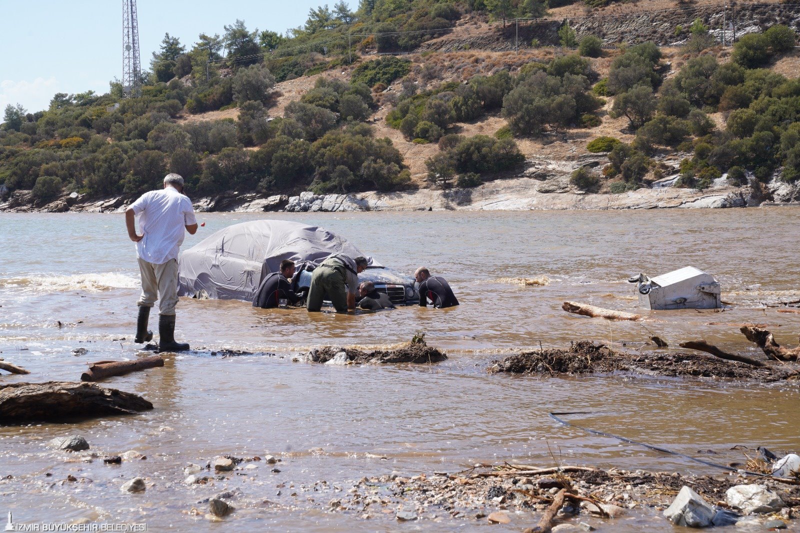 Çalışmalar hakkında bilgi veren İzmir Büyükşehir Belediyesi İtfaiye Dairesi Başkanlığı Acil Müdahale ve Yangın Şube Müdürü Aydın Mutlu, “Gece saatlerinde metrekareye 127 kilogramlık bir yağış düştü. Bu sebeple dağlarda bulunan malzemeler sürüklenerek yolda bulunan araçları da alıp denize döktü. Deniz içerisinde iki tane aracımız vardı. Vinç yardımıyla araçların kurtarma işlemini yaptık. Şu anda son kalan aracı da kurtarıyoruz. Yağış ve sel nedeniyle evlerin içerisine sular girdi. Yaklaşık 12 evde su çekme işlemi yaptık. Vatandaşlarımızın ihtiyacı olan noktalarda su çekme işlemine devam ediyoruz. Şu an bölgede olumsuz bir durum kalmadı” şeklinde konuştu.