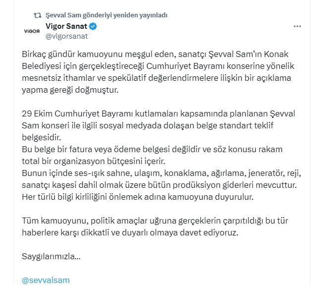 Birkaç gündür kamuoyunu meşgul eden, sanatçı Şevval Sam’ın Konak Belediyesi için gerçekleştireceği Cumhuriyet Bayramı konserine yönelik mesnetsiz ithamlar ve spekülatif değerlendirmelere ilişkin bir açıklama yapma gereği doğmuştur.