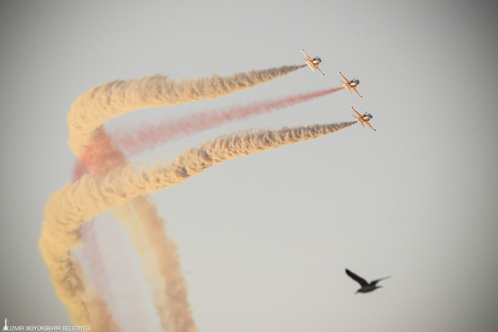 İzmir, Türkiye Cumhuriyeti’nin kuruluşunun 101’inci yıl coşkusunu gün boyu nefes kesecek etkinliklerle kutlamaya hazırlanıyor. Kentin dört bir yanında devam edecek 29 Ekim Cumhuriyet Bayramı kutlamaları kapsamında Türk Hava Kuvvetleri’nin gururu Türk Yıldızları, 500’üncü yurt içi gösterisi için hazırlanıyor. İzmirliler prova uçuşu yapan Türk Yıldızları’nı hayranlıkla izledi.