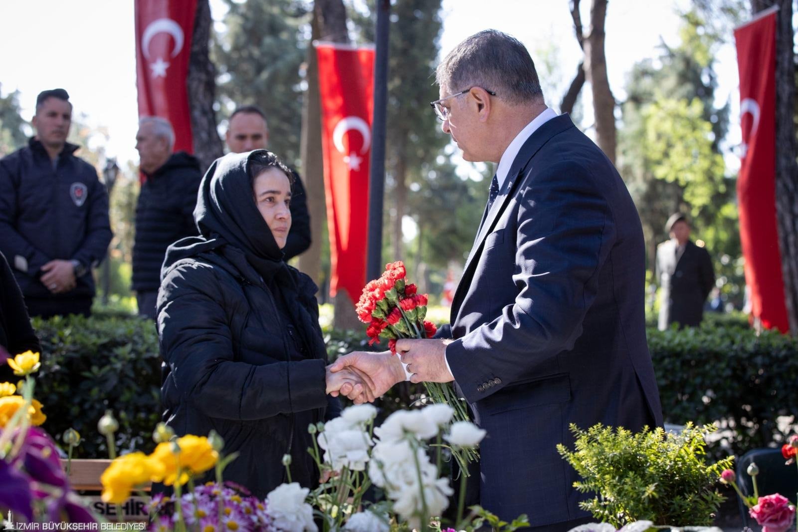 Törende Buca 85. Yıl Anadolu Lisesi öğrencisi Ela Ecem Fındıkoğlu, “Çanakkale” adlı şiiri okudu. İzmir Valisi Dr. Süleyman Elban şehitlik defterini imzalandı. Kuran-ı Kerim Tilaveti ve dua okundu. Daha sonra şehit kabirleri ziyaret edildi ve çiçek bırakıldı. İzmir Büyükşehir Belediye Başkanı Dr. Cemil Tugay, şehitliklere karanfil bırakarak dua okudu. Şehit yakınları ve gazilerle de sohbet etti.