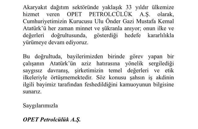 Bu doğrultuda, bayilerimizden birinde görev yapan bir çalışanın Atatürk'ün aziz hatırasına yönelik sergilediği saygısız davranış, şirketimizin temel değerleri ve etik ilkeleriyle örtüşmemektedir. Söz konusu şahsın iş akdinin ilgili bayimiz tarafından feshedildiğini kamuoyunun bilgisine sunarız."