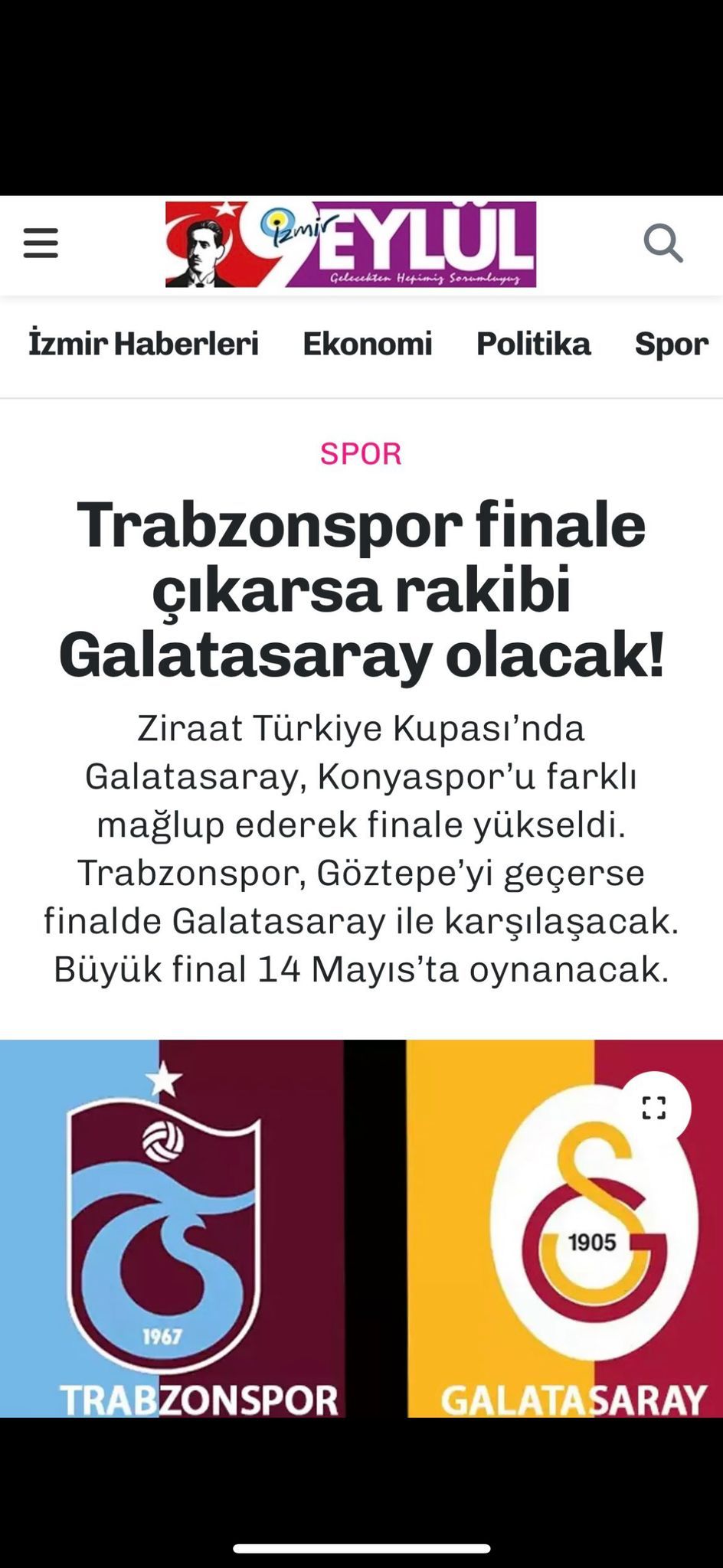 BEN HABER-İzmir Gazeteciler Cemiyeti’nin gazetesi olan 9 Eylül’de, Türkiye Kupası’nda Trabzonspor-Göztepe maçı öncesi skandal bir haber paylaşıldı. Gazetenin haber sitesinde “Trabzonspor finale çıkarsa rakibi Galatasaray olacak” şeklinde haber paylaşıldı. Haberi görenler bu "Bu nasıl İzmir gazetesi?” yorumunu yaptı.
