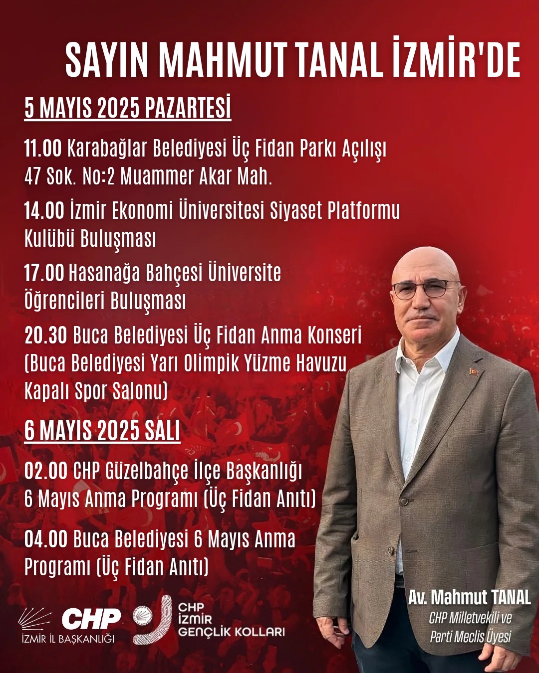 CHP İl Başkanlığı, ziyareti "Sayın Vekilimiz Mahmut Tanal'ın İzmir'de çok işi var!" sloganıyla duyururken, "5 Mayıs Pazartesi ve 5 Mayıs'ı 6 Mayıs'a bağlayan gece Milletvekilimiz ve Parti Meclis Üyemiz Sayın Mahmut Tanal ile birlikte İzmir'in çeşitli noktalarında olacağız." şeklinde belirtti.