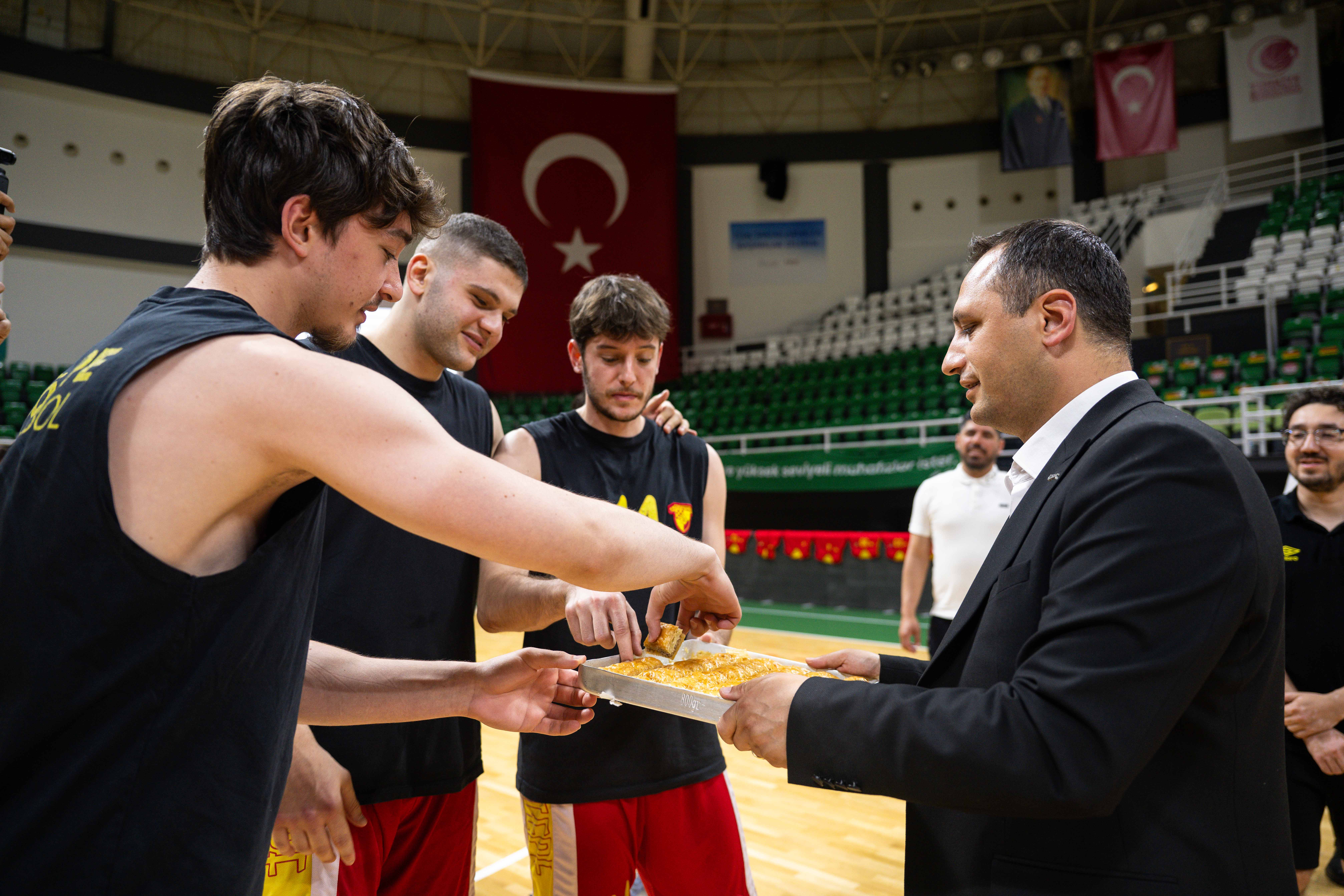 Göztepe, 15 Mayıs Çarşamba(Bugün) saat 20.00’de Bornova Belediyesi Atatürk Spor Kompleksi’nde oynayacağı kritik Ada Yem Uşak Basketbol maçı öncesi Bornova Belediye Başkanı Ömer Eşki’nin ziyareti ile moral buldu. Başkan Eşki, sarı-kırmızılı oyunculara baklava ikram ederek başarılar diledi.