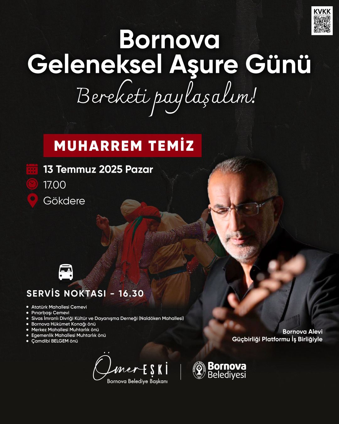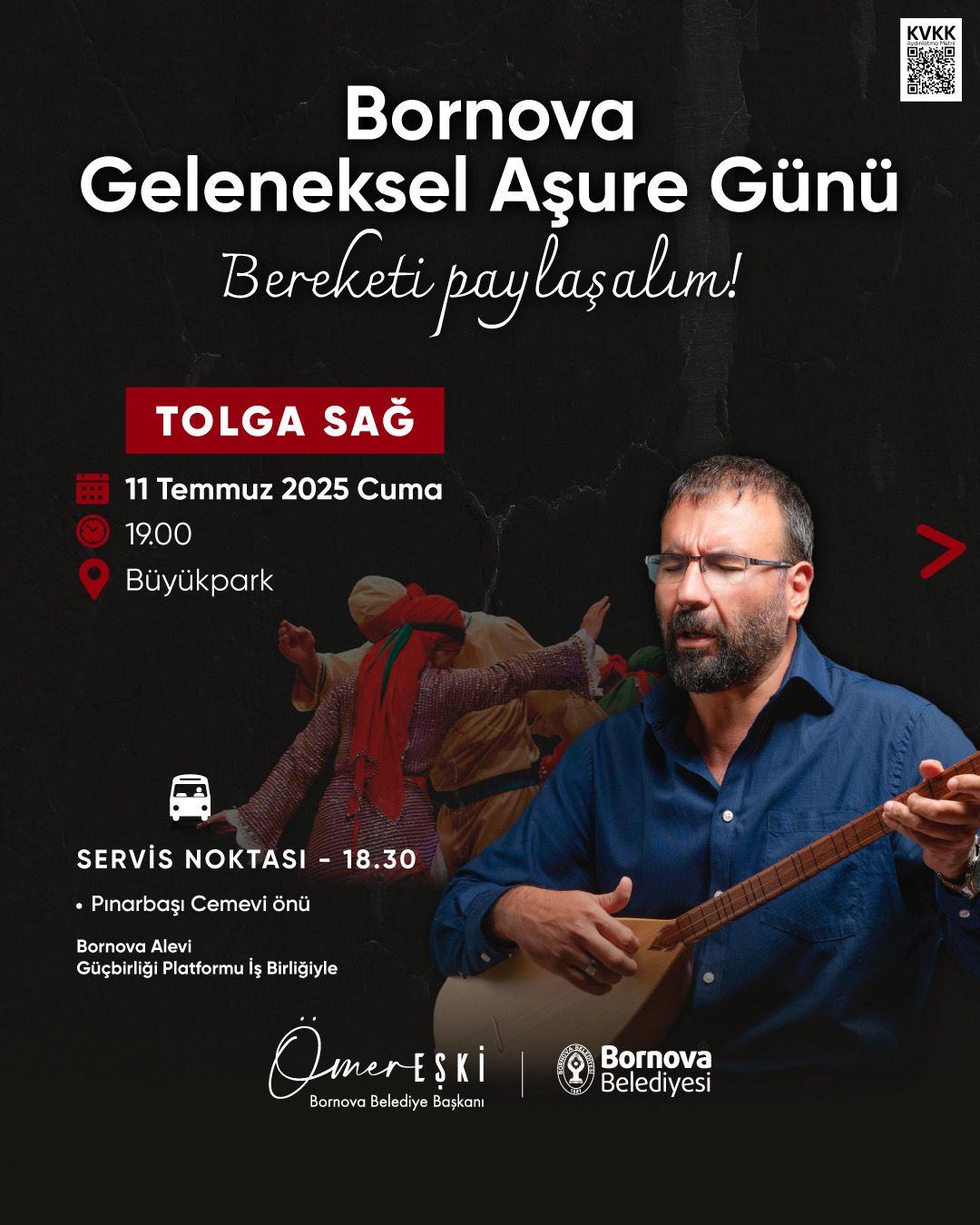11 Temmuz Cuma günü saat 19.00'da Büyükpark'ta başlayacak olan etkinlikte, Türk Halk Müziğinin güçlü sesi Tolga Sağ katılımcılara unutulmaz bir akşam yaşatacak. 13 Temmuz Pazar günü saat 17:00'de ise etkinlikler Gökdere Köyü'nde devam edecek. Türk Halk Müziği sanatçısı Muharrem Temiz bağlamasıyla sahne alacak. Türküler eşliğinde aşure dağıtımının yapılacağı etkinliklerde, Bornovalılar birlik ve beraberlik içinde Muharrem Ayı'nın manevi değerlerini paylaşacak.