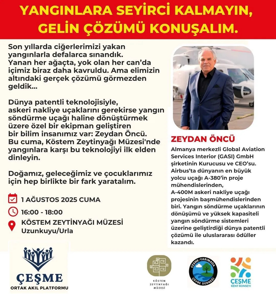 Çeşme Ortak Akıl Platformu tarafından yapılan açıklamada, “Son yıllarda yaşadığımız orman yangınları, doğamızı ve geleceğimizi tehdit ediyor. Oysa elimizin altında etkili bir çözüm var: Türk mühendis Zeydan Öncü, askeri nakliye uçaklarını yalnızca 8 saniyede 20 bin litre su bırakabilen yangın söndürme uçaklarına dönüştüren dünya patentli bir sistem geliştirdi. Airbus A380 ve A400M projelerinde görev almış, Avrupa’da ödüllere layık görülmüş Öncü, bu sistemi ilk kez kamuoyuna anlatacak.” ifadelerine yer verdi.