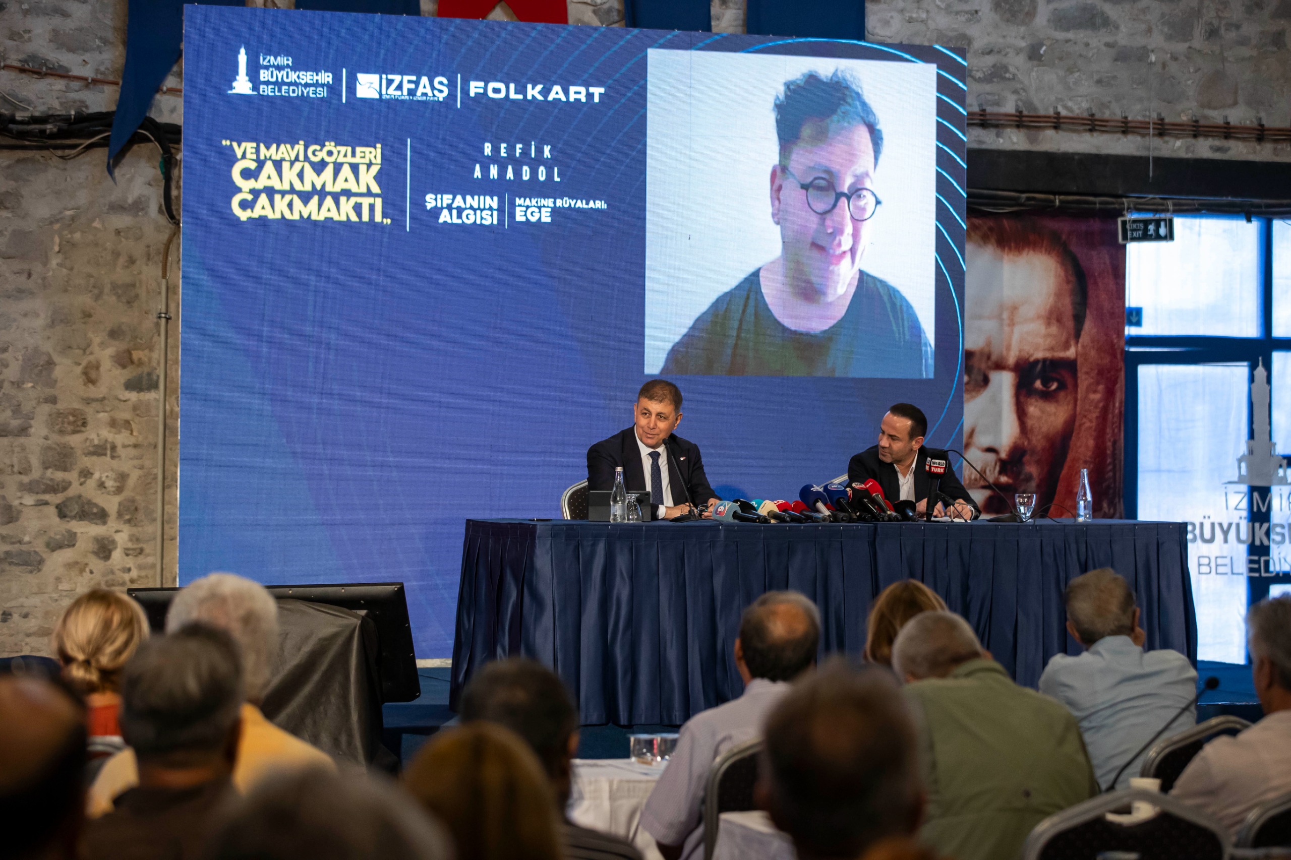Toplantıya çevrim içi katılan dünyaca ünlü sanatçı Refik Anadol da hem Başkan Dr. Cemil Tugay ve Mesut Sancak’a hem de toplantıyı takip eden basın mensuplarına duygularını ve eserlerinin içeriğini anlattı. Anadol, “Çok heyecanlıyım. Bu pek bilinmiyor ama hayatımın 19 yazını Seferihisar’da yaşamış biri olarak öğrendiğim kadarıyla ‘İzmirliyim’ diyebiliyormuşum. En iyi fikirlerimizi Türkiye’ye getirmeye önem gösteriyorum, bu sebeple bu sergi çok anlamlı. İnsan ve makine ilişkisinin tamamen değiştiği döneme girdik. Bu eseri de İzmir’de paylaşmak çok anlamlı. 10 yıl önce yapay zekâ ile çalışmaya başladım. Dünya yeni yeni yapay zekânın ne olduğunu ve kullanıldığında kıymetli bir düşünce biçimi olarak başarılı olduğunun farkına varıyor. İkinci eser de dünyada ilk defa, ilk örneği olan eser olması anlamında çok özel. Sergimiz yapay zekâ ağlarıyla Ege Denizi’nin görkemli hareketlerini, İzmir’in rüzgârlarının hareket sağladığı, doğayı görünür kılan yapay zekâ algoritması ile şiirsel eser olarak ortaya çıkıyor. Sergimizde geçmiş ve geleceğe dair hayal kurabilmek çok anlamlı” ifadelerini kullandı. Anadol, sergi boyunca genç sanatçılar için uzaktan bir atölye yapacağını, burada yapay zekâ üzerinden işi nasıl ürettiğini ve insan zihninin hareketlerinin nasıl olduğunu gösteren bilgiler vereceğini kaydetti. Başkan Tugay ise bu çalışma için organizasyonu yürüteceklerini duyurdu.