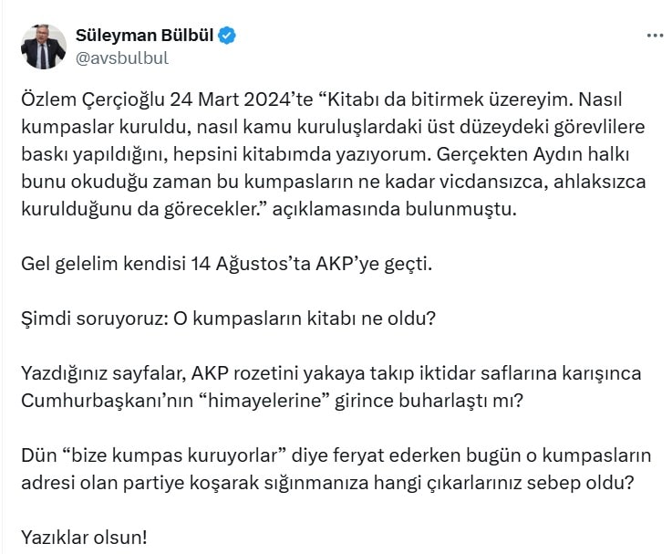 CHP Aydın Milletvekili Süleyman Bülbül, sosyal medya hesabından yaptığı paylaşımda Çerçioğlu'nun 24 Mart 2024 tarihinde verdiği röportaja dikkat çekerek "O kumpasların kitabı ne oldu?" ifadelerini kullandı.