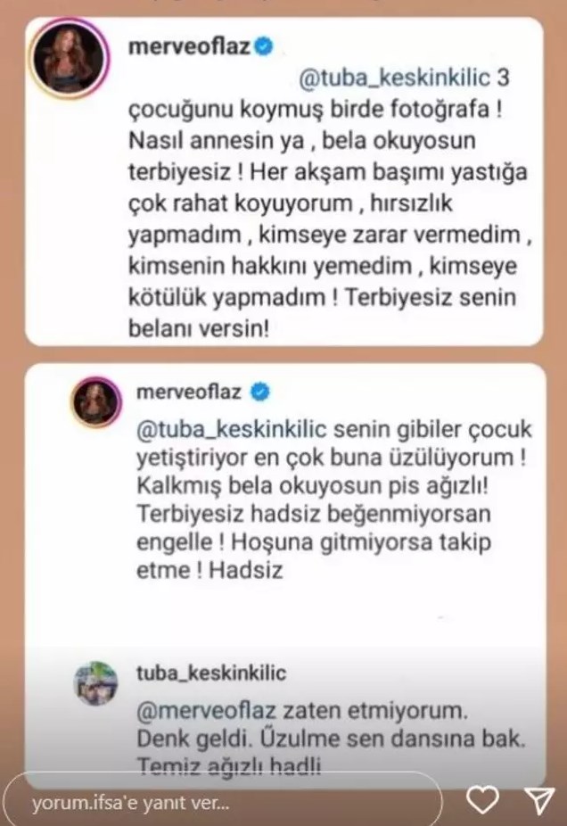 Merve Oflaz hızını alamayarak "Senin gibiler çocuk yetiştiriyor en çok buna üzülüyorum kalkmış bela okuyorsun pis ağızlı. Terbiyesiz hadsiz beğenmiyorsan engelle" diyerek sitem etti.