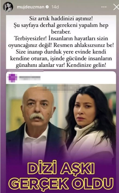 Güzel oyuncu sosyal medyada yaptığı paylaşımda, "Siz artık haddinizi aştınız. "Terbiyesizler! İnsanların hayatları sizin oyuncağınız değil! Resmen ahlaksızsınız be! Size inanıp evinde kendi kendine oturan, işinde gücünde insanların günahını alanlar var" diyerek ateş püskürdü.
