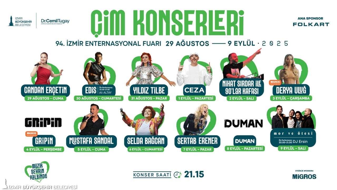 Fuarın en sevilen ve klasikleşen etkinliklerinden Çim Konserleri, bu yıl da on binlerce müzikseveri Kültürpark’ta buluşturacak. 29 Ağustos’ta Candan Erçetin ile başlayacak konser serisi, 30 Ağustos’ta Edis ve ön performansta Ali Altay ile İzmirlilere Zafer Bayramı coşkusunu yaşatacak. 31 Ağustos’ta Yıldız Tilbe, 1 Eylül’de Ceza, 2 Eylül’de Nihat Sırdar ile 90’lar Kafası sahnede olacak. 3 Eylül’de Derya Uluğ, 4 Eylül’de de Gripin Migros sponsorluğunda Çim Konserleri’nde yer alacak. Çim Konserleri kapsamında 5 Eylül’de Mustafa Sandal, 6 Eylül’de Selda Bağcan, 7 Eylül’de Sertab Erener, 8 Eylül’de Duman sahne alacak. Fuarın son günü 9 Eylül’de ise Mor ve Ötesi, İzmir’in kurtuluşunun 103. yılına yakışır bir final yapacak. Konserler saat 21.15’te başlayacak.