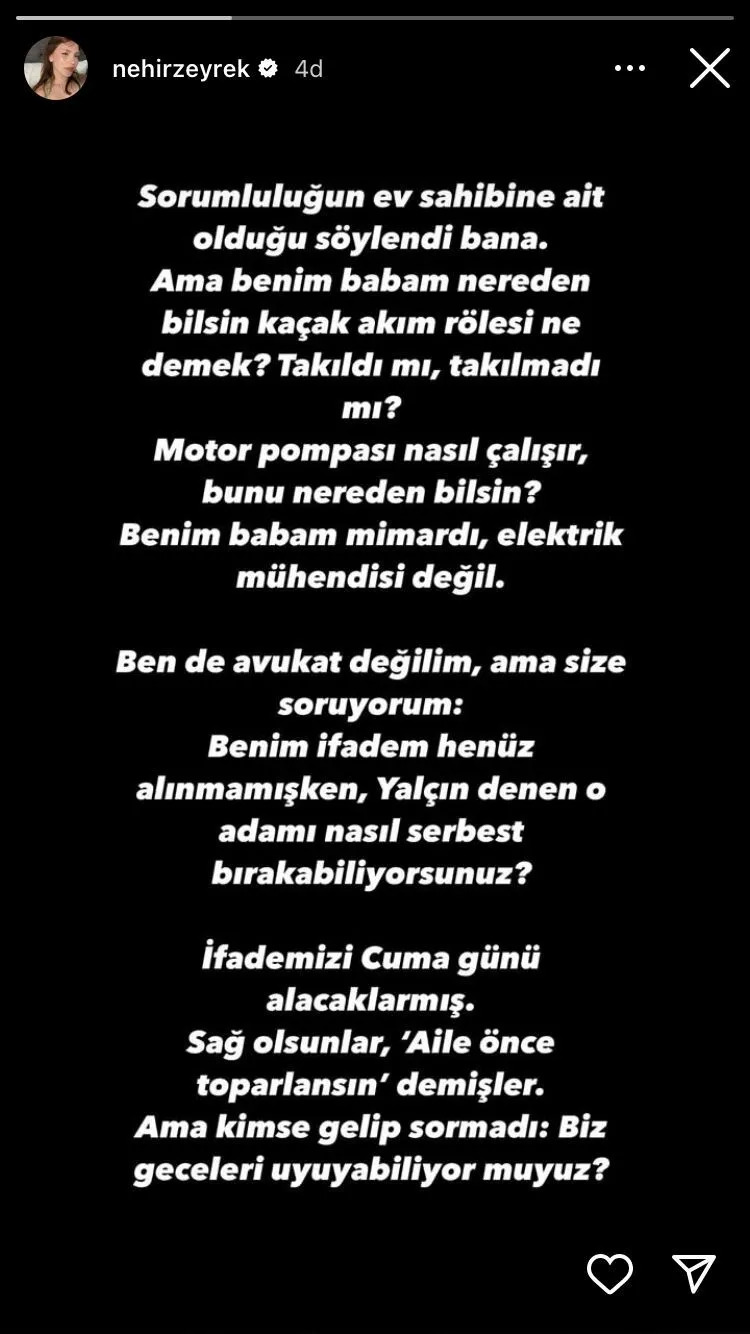 Nehir Zeyrek, paylaşımında, babasının ölümünde ihmali olduğu iddia edilen kişilerin ifadeleri alındıktan sonra serbest bırakılmasına tepki gösterdi. Henüz kendi ifadesi alınmamışken, ismini verdiği bir şüphelinin serbest bırakılmasını eleştirerek, “Benim ifadem alınmamışken, Yalçın denen o adamı nasıl serbest bırakabiliyorsunuz? “Sağ olsunlar, ‘Aile önce toparlansın’ demişler. Ama kimse gelip sormadı: Biz geceleri uyuyabiliyor muyuz?” ifadelerini kullandı.