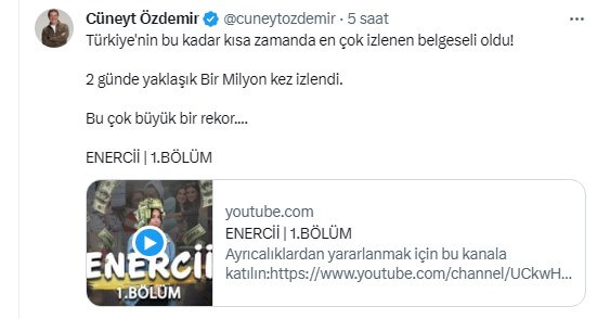 Cüneyt Özdemir, X hesabından Enercii belgeselinin 1. bölümünü paylaşarak, "Türkiye'nin bu kadar kısa zamanda en çok izlenen belgesi oldu." notunu düştü.