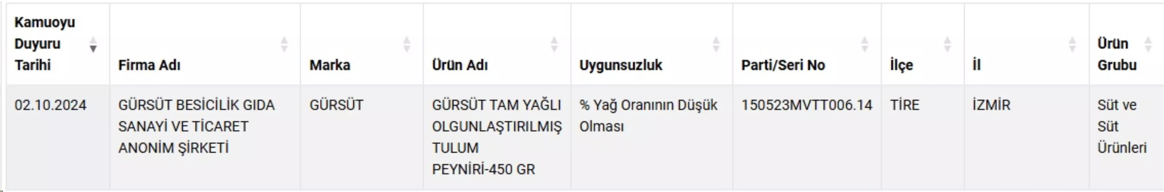 Gürsüt’ün tulum peynirinde yağ oranı olması gerekenden düşük çıkması, şirketi listeye dahil olmasına neden olmuştu.