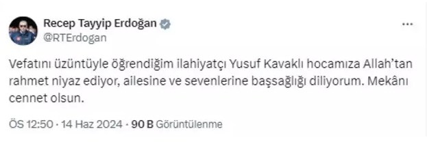 Cumhurbaşkanı Erdoğan da Kavaklı için başsağlığı mesajı yayımladı. Erdoğan sosyal medya paylaşımında "Vefatını üzüntüyle öğrendiğim ilahiyatçı Yusuf Kavaklı hocamıza Allah’tan rahmet niyaz ediyor, ailesine ve sevenlerine başsağlığı diliyorum. Mekânı cennet olsun" ifadelerine yer verdi.