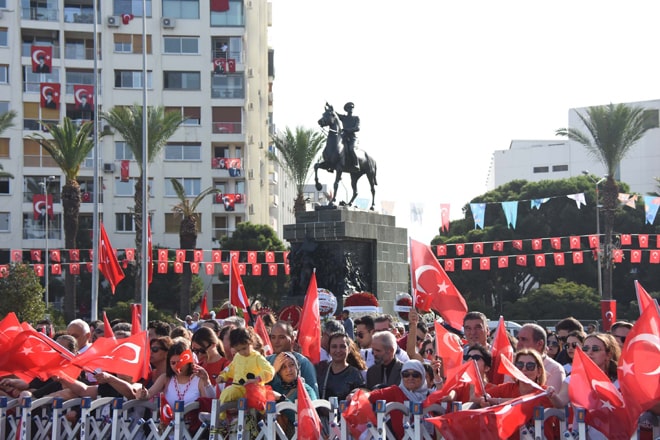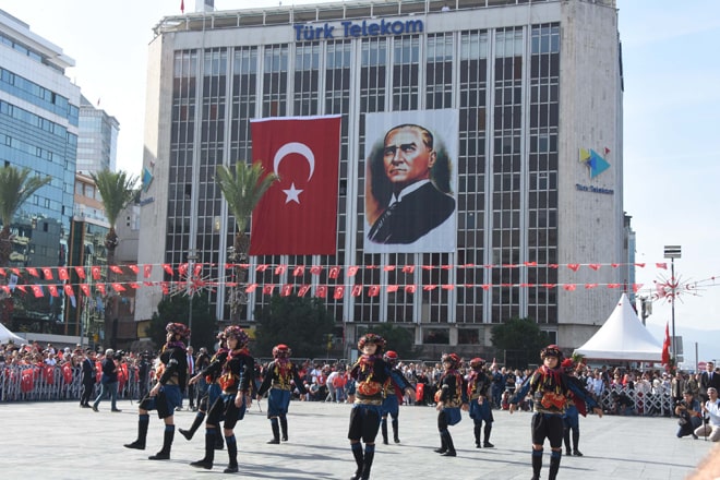 Cumhuriyetin 100'üncü yılı kutlamaları İzmir Valiliği'nde yapılan tebrikat töreniyle başladı. İzmir Valisi Süleyman Elban, tebrikleri kabul ettikten sonra Cumhuriyet Meydanı'nda resmi kutlama töreni yapıldı. Vali Elban, Ege Ordusu ve Garnizon Komutanı Orgeneral Kemal Yeni ve İzmir Büyükşehir Belediye Başkanı Tunç Soyer, tören aracıyla kutlamaya gelen vatandaşların bayramını kutladı. Saygı duruşu ve İstiklal Marşı'nın ardından Cumhurbaşkanı Recep Tayyip Erdoğan'ın 29 Ekim Cumhuriyet Bayramı mesajları okundu.