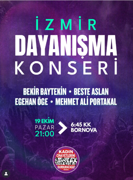 Kadın Cinayetlerini Durduracağız Platformu olarak tamamen gönüllü bir platform olduklarını söyleyen Tülin Osmanoğulları, “19 Ekim Pazar günü dayanışma gecemizin ayrı bir önem var. Çünkü geceyi düzenleyen arkadaşlarımız Özgecan Aslan'ın ailesi... İzmir Devlet Opera ve Balesi'nde sanatçı olan ablası, kadın mücadelesi için destek vermek için platformumuzla birlikte dayanışma gecesi düzenlemeye karar verdi. “Özgecan Aslan” ülkemizde milattır, arkada bir de ailesi var. Dayanışma gecesini birlikte düzenlemek bizim için çok kıymetli ve anlamlı. Dayanışma gecesine gelemeyenler, öğrencilere ulaştıracağımız 'Askıda Bilet' kampanyasıyla bize destek olabilirler” dedi.