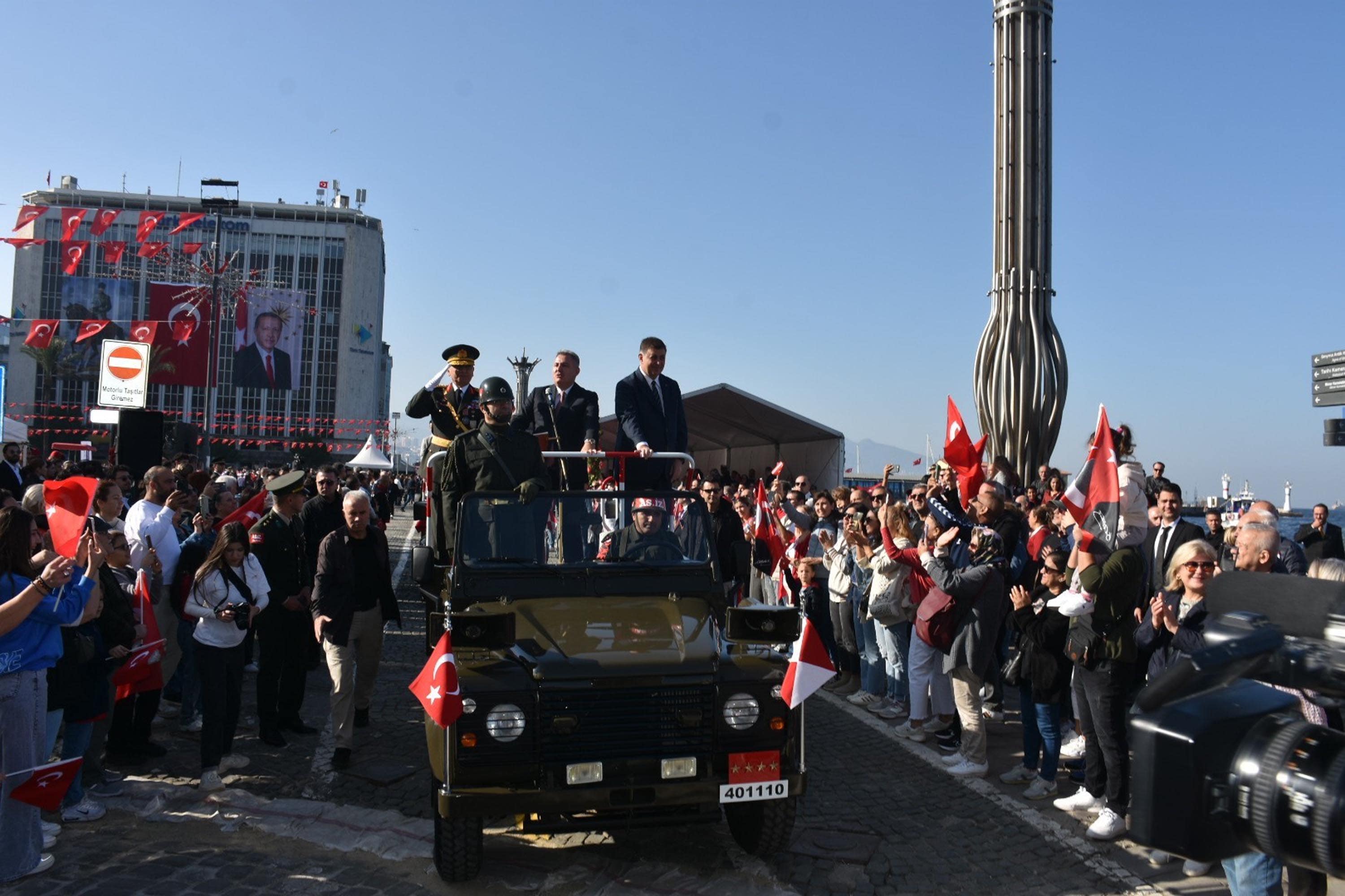 Cumhuriyetin 101'inci yılı kutlamaları kapsamında ilk olarak İzmir Valiliği'nde tebrikat töreni düzenlendi. İzmir Valisi Süleyman Elban, tebrikleri kabul ettikten sonra Cumhuriyet Meydanı'nda resmi kutlama töreni yapıldı. Vali Elban, Ege Ordusu ve Garnizon Komutanı Orgeneral İrfan Özsert ve İzmir Büyükşehir Belediye Başkanı Cemil Tugay, tören aracıyla vatandaşları selamlayıp, bayramını kutladı. Saygı duruşunda bulunulması ve İstiklal Marşı'nın ardından Cumhurbaşkanı Recep Tayyip Erdoğan'ın 29 Ekim Cumhuriyet Bayramı mesajı okundu.
