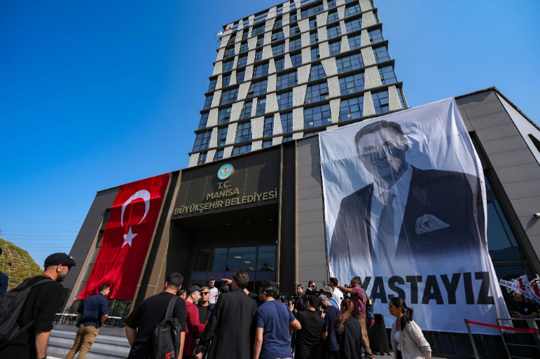 Hayatını kaybeden Manisa Büyükşehir Belediye Başkanı Ferdi Zeyrek için belediye binası önünde tören düzenleniyor. Binaya Türk bayrağı ve Zeyrek’in fotoğrafı asıldı.