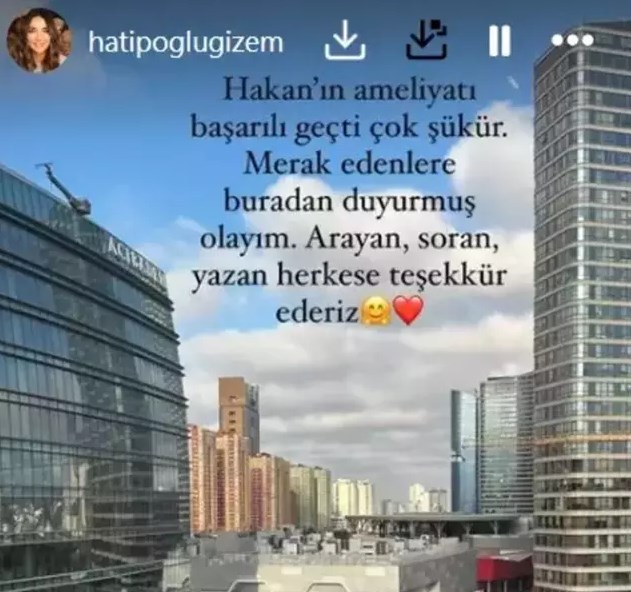 Gizem Hatipoğlu, paylaşımda: "Hakan'ın ameliyatı başarılı geçti çok şükür. Merak edenlere buradan duyurmuş olayım. Arayan, soran, yazan herkese teşekkür ederiz" ifadelerini kullandı.