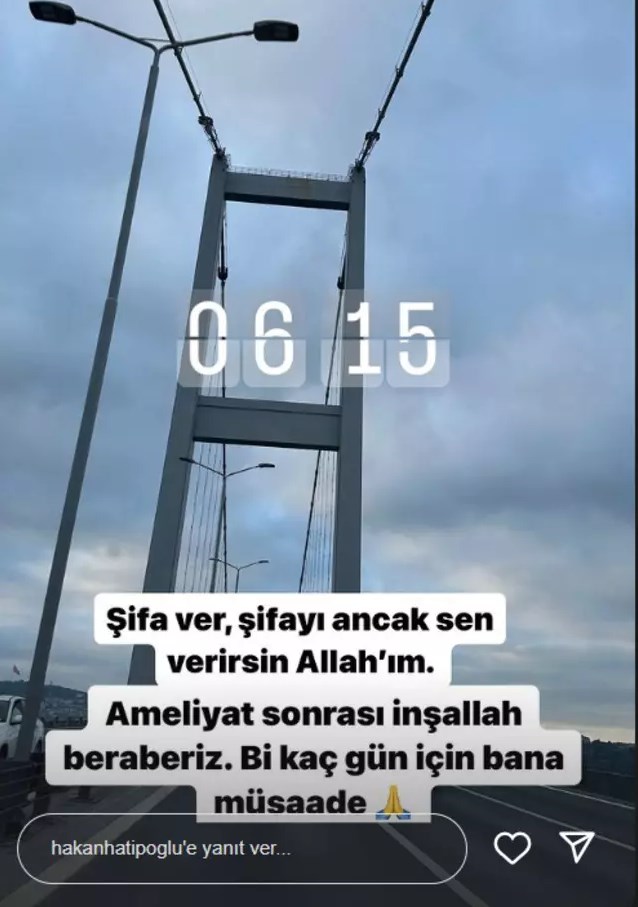 Hatipoğlu, sosyal medya hesabından ise "Şifayı ver, şifayı ancak sen verirsin Allah'ım. Ameliyat sonrası inşallah beraberiz. Birkaç gün bana müsaade!" paylaşımı yapmıştı.