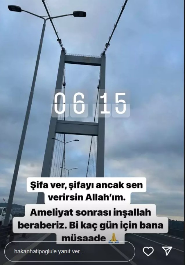 Hatipoğlu, sosyal medya hesabından ise "Şifayı ver, şifayı ancak sen verirsin Allah'ım. Ameliyat sonrası inşallah beraberiz. Birkaç gün bana müsaade!" paylaşımı yaptı.