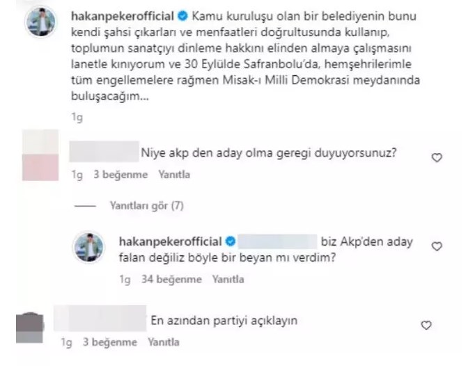 Hakan Peker ayrıca paylaşımına gelen bir takipçisinin "Neden AK Parti'den aday olma gereği duyuyorsunuz?" sorusuna da "AK Parti'den aday değiliz. Böyle bir beyan mı verdim?" cevabını verdi.