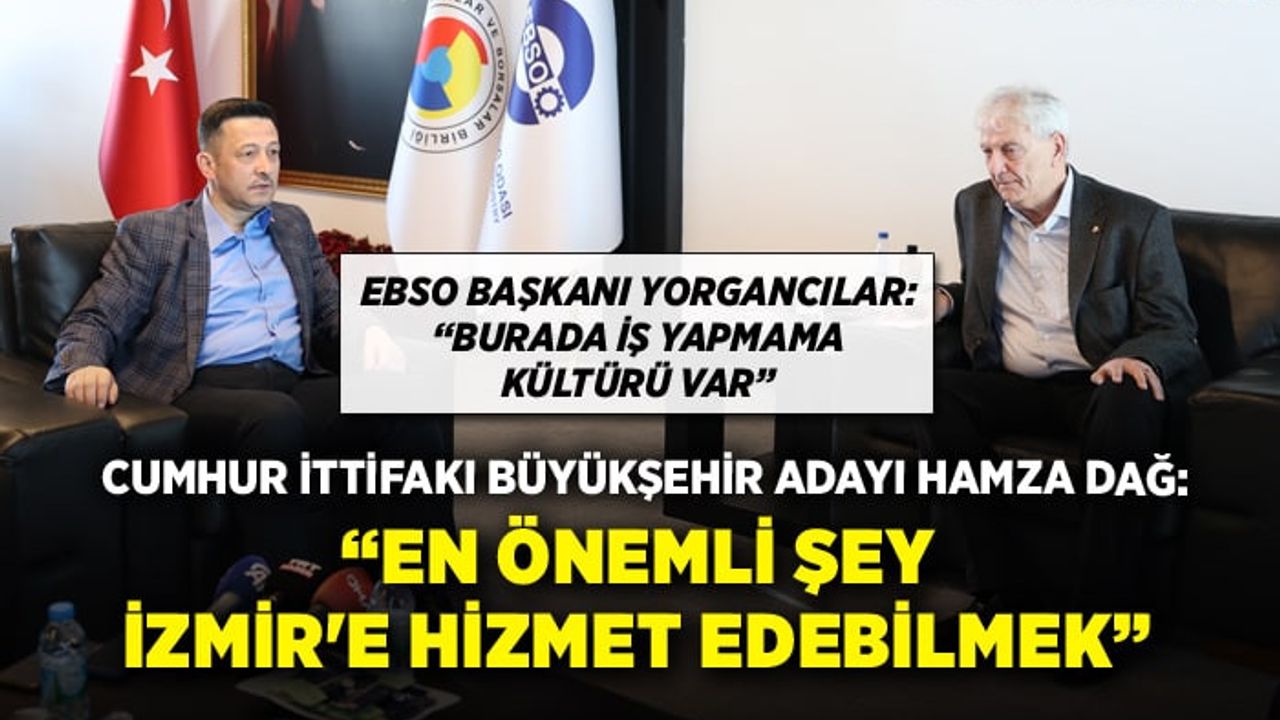 AK Parti İzmir Büyükşehir Belediye Başkan adayı Hamza Dağ, seçim çalışmaları kapsamında Ege Bölgesi Sanayi Odası'nı ziyaret etti. Dağ'a, AK Parti Konak İlçe Başkanı Sait Başdaş ve partililer de eşlik etti. EBSO Başkanı Ender Yorgancılar sanayicilerin yaşadığı sıkıntıları anlatırken, İzmir'in trafik sorununa da dikkat çekti. Hamza Dağ, başkan seçilirse kentin kronik sorunlarına çözüm üreteceklerini belirtti. İzmir'in sokaklarını 1 aydır gezdiklerini ve çok güzel bir süreç geçirdiklerini belirten Hamza Dağ, "Sahadan olumlu dönüşler alıyoruz, projelerimizi de açıkladık. Çok daha vizyon anlamında projeler için düşüncelerimiz var. Ancak önce kronik sorunları çözmemiz lazım. Trafik, sosyal konut, sosyal belediyecilik ve kentsel dönüşümle ilgili adımları atacağız. Sanayi ve ticaret İzmir'in olmazsa olmazlarından. İzmir, deniz ticaretinin başladığı şehirlerden. Sonra metropol büyükşehir oluyor. Son dönemde önemli sektörler ön plana çıkmaya başladı. Desteklerimizle bu sektörler çok daha büyüyecektir. Bunlardan birisi bilişim ve teknokent meselesi. Türkiye'de bu alanda çalışacak kişiler kesinlikle İzmir'de yaşamak ister. Ciddi bir çalışma var. Liman arkasındaki tarihi mekanları restore ederek orada bilişim teknokent merkezi yapacağız. Yenilenebilir enerji üretimi konusunda bölgemizde hareketlilik var. Daha da artıracağız. Çandarlı Limanı ve arkasını planlamak zorunda olduğumuzu biliyorum. Sağlık turizmi de önemli. Önemli bir imkan önümüzde var. Denizi ve kaplıcası olması avantaj. Özel hastane ve otel yönünden daha iyi olmalıyız" dedi.