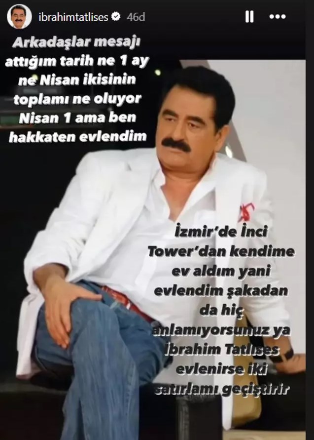 "Arkadaşlar mesajı attığım tarih ne 1 ay ne Nisan ikisinin toplamı ne oluyor. Nisan 1 ama ben hakikaten evlendim. İzmir'de kendime ev aldım. Şakadan hiç anlamıyorsunuz ya İbrahim Tatlıses evlenirse iki satırla mı geçiştirir."