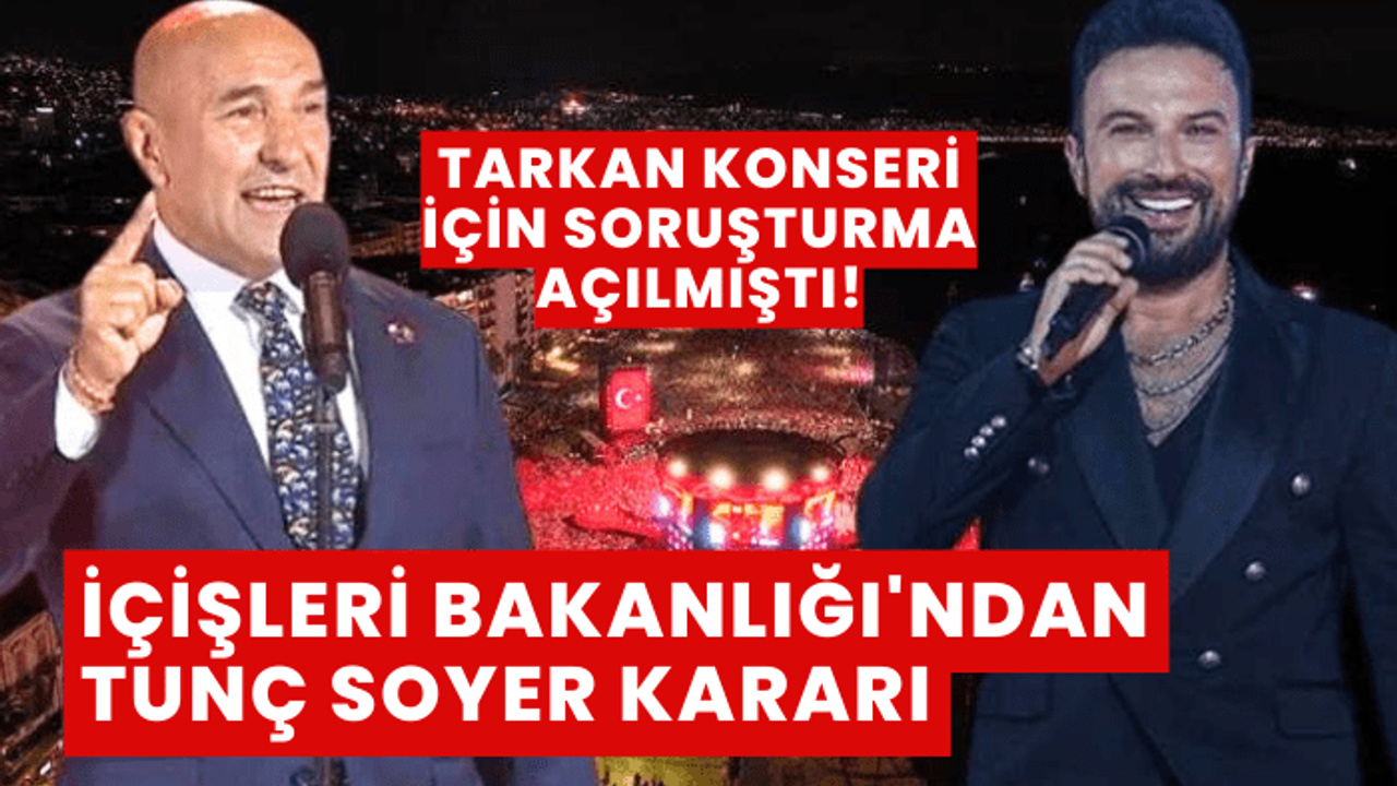 İçişleri Bakanlığı, İzmir Büyükşehir Belediyesi’nin, şehrin kurtuluşunun 100’üncü yıldönümü olan 9 Eylül 2022'de düzenlediği Tarkan konseriyle ilgili yapılan harcamalara ilişkin iddialar konusunda, önceki dönem Büyükşehir Belediye Başkanı Tunç Soyer hakkında soruşturma açılmasına gerek olmadığına karar verdi.