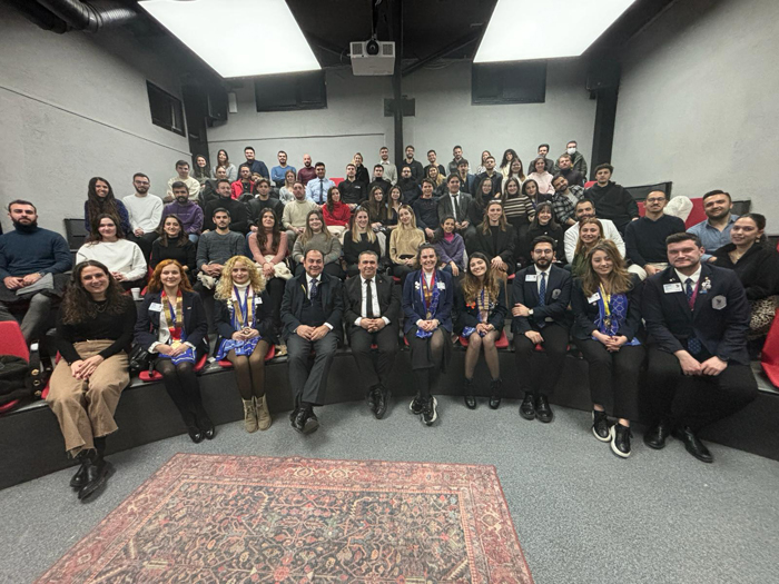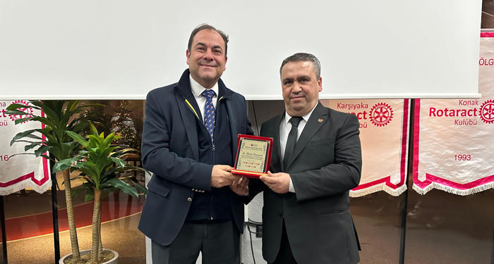 Fotoaltı: Ekonomi Muhabirleri Derneği İzmir Şubesi Başkanı ve İzmir Basın Grubu Moderatörü Murat Demircan'a Meslek Hizmetleri Ödülünü, Uluslararası Rotary 2440. Bölge Gelecek Dönem Guvernörü Mert Korur takdim etti.