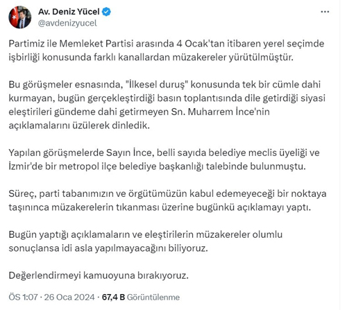 Yücel, 4 Ocak'tan itibaren Memleket Partisi ile yerel seçimde iş birliği konusunda farklı kanallardan müzakereler yürüttüklerini belirterek, "Bu görüşmeler esnasında, 'İlkesel duruş' konusunda tek bir cümle dahi kurmayan, bugün gerçekleştirdiği basın toplantısında dile getirdiği siyasi eleştirileri gündeme dahi getirmeyen Sayın Muharrem İnce'nin açıklamalarını üzülerek dinledik. Yapılan görüşmelerde Sayın İnce, belli sayıda belediye meclis üyeliği ve İzmir'de bir metropol ilçe belediye başkanlığı talebinde bulunmuştu. Süreç, parti tabanımızın ve örgütümüzün kabul edemeyeceği bir noktaya taşınınca müzakerelerin tıkanması üzerine bugünkü açıklamayı yaptı. Bugün yaptığı açıklamaların ve eleştirilerin müzakereler olumlu sonuçlansaydı asla yapılmayacağını biliyoruz" ifadelerini kullandı.