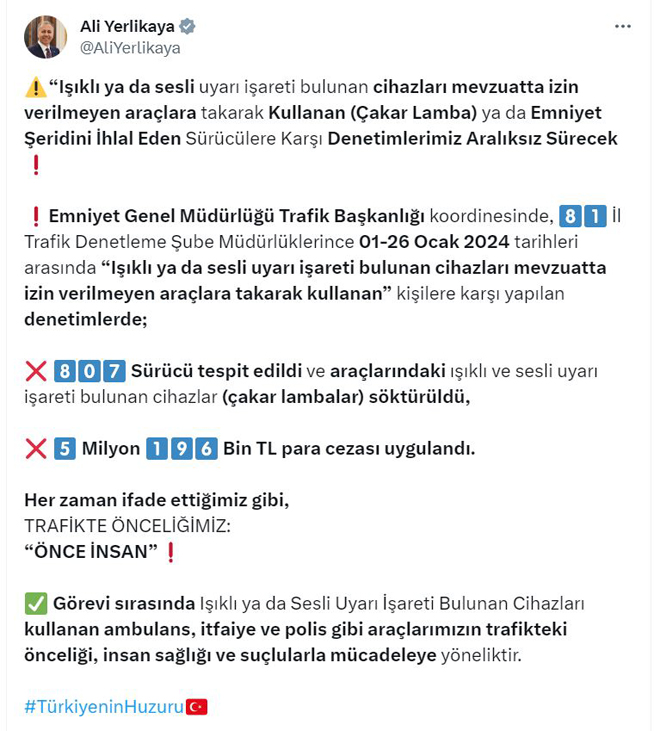 Bakan Yerlikaya, sosyal medya hesabından yaptığı açıklamada, "Emniyet Genel Müdürlüğü Trafik Başkanlığı koordinesinde, 81 İl Trafik Denetleme Şube Müdürlüklerince 01-26 Ocak 2024 tarihleri arasında 'Işıklı ya da sesli uyarı işareti bulunan cihazları mevzuatta izin verilmeyen araçlara takarak kullanan' kişilere karşı yapılan denetimlerde; 807 sürücü tespit edildi ve araçlarındaki ışıklı ve sesli uyarı işareti bulunan cihazlar (çakar lambalar) söktürüldü, 5 milyon 196 bin TL para cezası uygulandı" dedi. Yerlikaya, çakar lamba ya da emniyet şeridini ihlal eden sürücülere karşı denetimlerin aralıksız sürdürüleceğini vurgulayarak, şunları kaydetti: