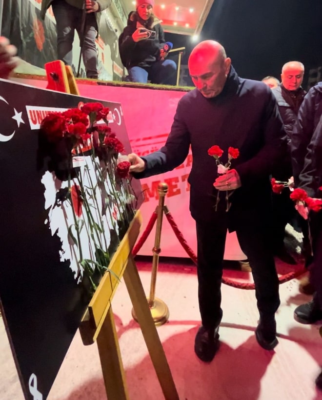 İzmir Büyükşehir Belediye Başkanı Tunç Soyer, “Acımız çok taze, çok kısa süre geçti. Deprem öldürmüyor aslında, cehalet ve ihanet öldürüyor. Daha birkaç hafta önce Japonya'da benzer şiddette deprem oldu 286 kişi öldü. Burada on binlerin öldüğünü biliyoruz. Japonlar kadar yaşama hakkı yok muydu bizim insanlarımızın? Deprem bölgesinde, kuşağında yaşayan bir ülkeyiz. Maalesef ülkeyi yönetenler hiçbir zaman bunun idrakinde olmadıkları için bu kadar kayıp verdik. Dilerim bundan sonra gelecekler bu bilinçle insanların en temel yaşam hakkına saygı duyarak, koruyarak devleti yönetirler” diye konuştu.