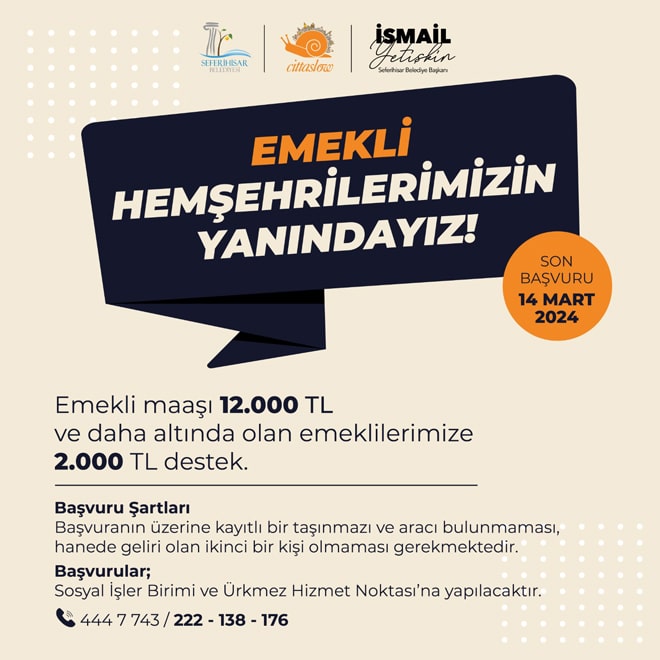 Müjdeyi duyuran Yetişkin, "Seferihisarımızın emektar emeklilerini yalnız bırakmayacağız dedik ve emekli hemşehrilerimize destek müjdesi vermeye karar verdik. Emekli maaşı 12 bin TL ve altında olan hemşehrilerimize 2 bin TL destek sağlıyoruz. Gelin Sosyal Hizmetler Birimimize başvurun, destek projemizden faydalanın. Seferihisar'da kimse ekonomik krizin yükünü taşımasın diye sosyal belediyecilik anlayışıyla çalışmaya devam edeceğiz" dedi.
