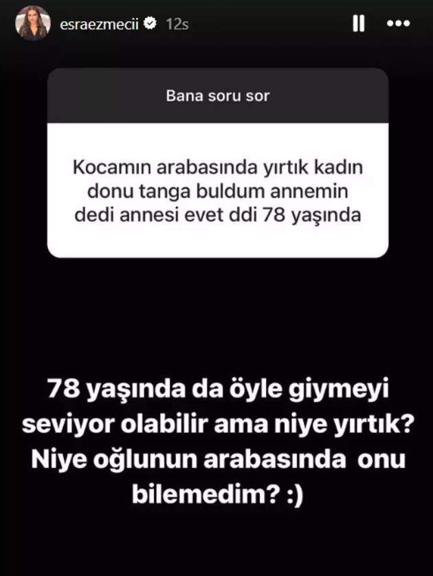 Yine Instagram hesabından soru- cevap yapan Ezmeci'ye bir takipçisi "Kocamın arabasında yırtık kadın iç çamaşırı buldum. 'Annemin' dedi. Annesi 78 yaşında..." sorusunu yöneltti.