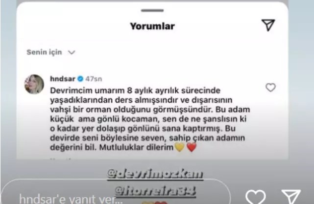 Hande Sarıoğlu "Umarım 8 ayılık ayrılık sürecinde yaşadıklarından ders almışsındır ve dışarısının vahşi bir orman olduğunu görmüşsündür. Bu adam küçük ama gönlü kocaman sen de ne şanslısın ki o kadar yer dolaşıp gönlünü sana kaptırmış" dedi.