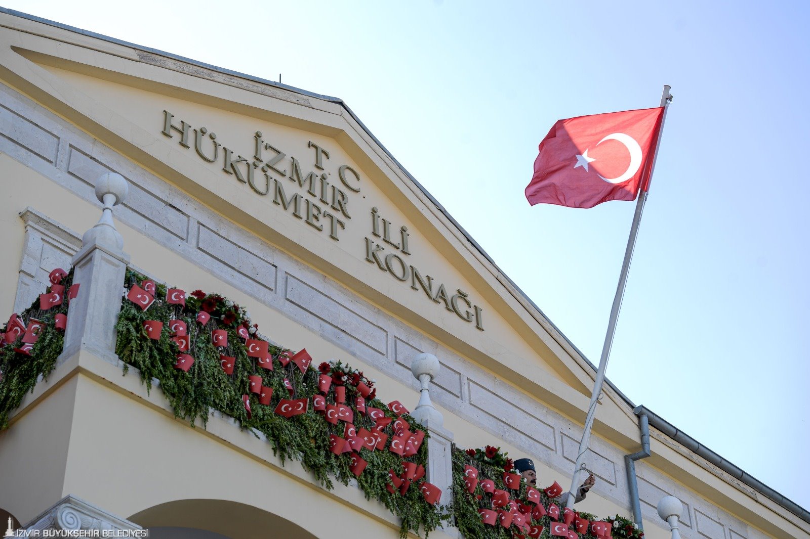 Konak Atatürk Meydanı’na gelen süvari birlikleri, kentin kurtuluşunu simgeleyen tarihi sahneyi bir kez daha canlandırdı. İzmirlilerin alkışları arasında bir asker Türk Bayrağı’nı Hükümet Konağı’nın gönderine çekti. Bayrağı göndere çeken askere Kur’an-ı Kerim ve bayrak takdimi edildi. İzmir Büyükşehir Belediye Başkanı Dr. Cemil Tugay da Yüzbaşı Şerafettin’i temsil eden Süvari Birlikleri Komutanı’na teşekkür plaketi sundu.