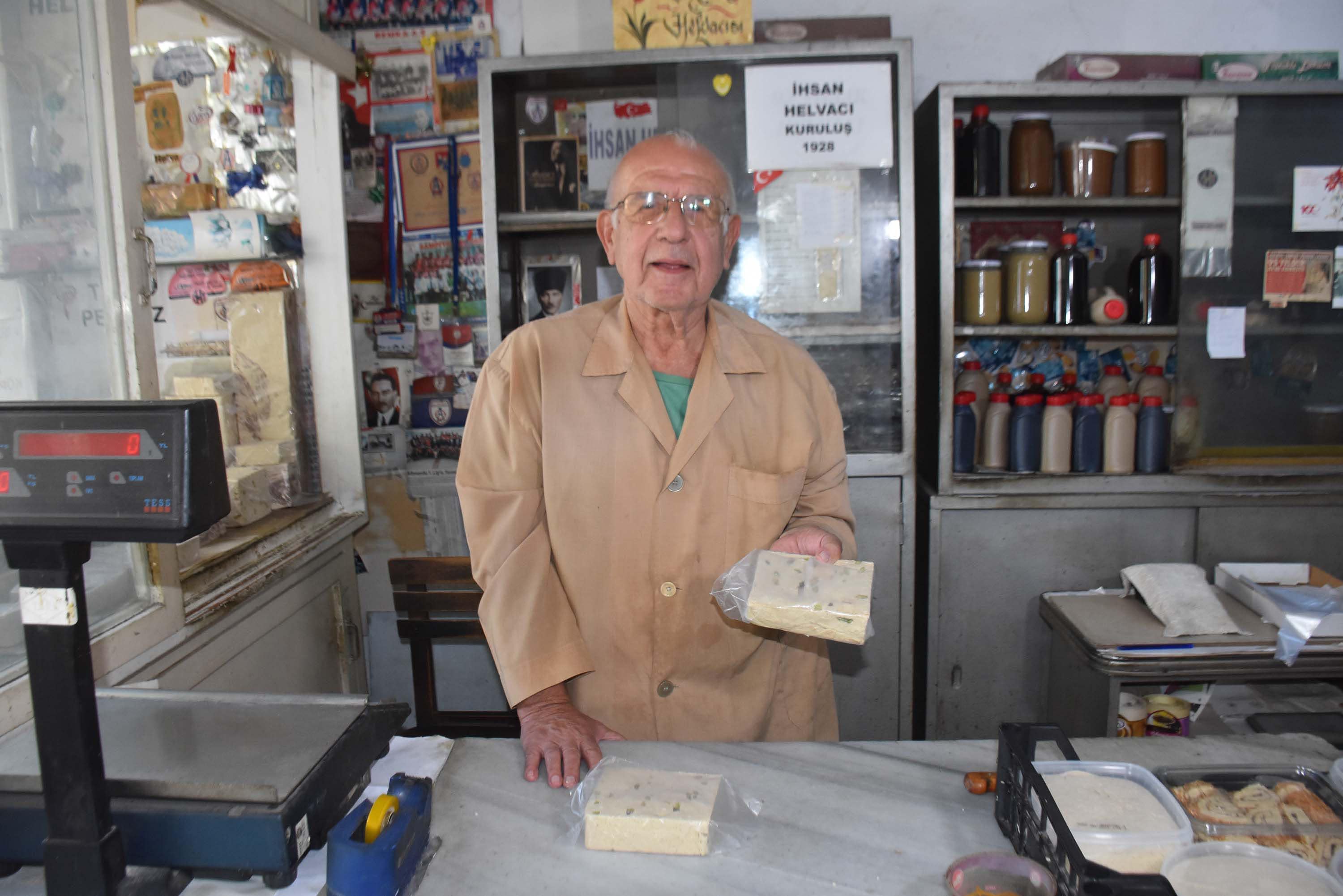 Tarihi evleri, dükkanları ile kültürel mirasa ev sahipliği yapan Basmane'de bulunan, 1928 yılından beri açık olan dükkanlarında dede mesleği helvacılığı sürdüren İhsan Helvacı (77), 10 yaşında babasının yanında çırak olarak başladığı mesleğinde 67 yılı geride bıraktı. Anafartalar Caddesi'nde yer alan 96 yıllık dükkanlarında helva, tahin ve pekmez satan Helvacı, dedesinin Osmanlı döneminde Konya Akşehir'de helvacılık yaptığını belirterek, "Soyadı Kanunu çıkarken nüfus memurları, insanlara ne iş yaptıklarını sorarmış. Babamla amcam 'Dededen helvacıyız' deyince nüfus memuru da soyadınız 'Helvacı' olsun demiş. Bir amcamın soyadı da Tahincioğlu. Babam ve amcalarım Akşehir'de doğmuş. Babam Mehmet Helvacı ve amcam İbrahim Helvacı da İzmir'e gelip, 1928'de bu dükkanı açıyor" dedi.