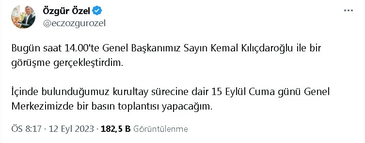 Özel, sosyal medya hesabından yaptığı paylaşımda, "Bugün saat 14.00'te Genel Başkanımız Sayın Kemal Kılıçdaroğlu ile bir görüşme gerçekleştirdim. İçinde bulunduğumuz kurultay sürecine dair 15 Eylül Cuma günü Genel Merkezimizde bir basın toplantısı yapacağım" ifadelerine yer verdi.