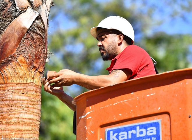 Ölmüş ağaçların kesilmesi gerektiğini ve bunun kamuoyunda yanlış anlaşıldığını aktaran Baydar, “Maalesef kamuoyunda çok yanlış anlaşılan bir durum var. Hastalanan ve ölmüş ağaçların kesilerek alandan uzaklaştırılması gerekiyor ki içindeki kırmızı palmiye böcekleri diğerlerine zarar vermesin. Biz bu kesilen ağaçların yerine hemen yenilerini dikiyoruz. Onları da hemen kontrol ve takip altına alıyoruz. Bu sistem oturduğu zaman da İzmir’deki bütün ağaçlarımız takip altında olacak. Sadece palmiyeler değil İzmir’deki bitkilerin hepsi bizim canımız. Onlar bizim için çok kıymetli. Gözümüz gibi hepsine bakıyoruz. Çok hassasız bu konuda. Tüm bitkilerimizin gerekli hastalıklarla mücadelesini, ilaçlamasını, budamasını yapıyoruz” diye konuştu.