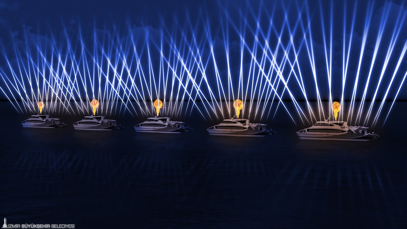 Saat 20.44’ten itibaren Cumhuriyet Meydanı açıklarındaki gemiler düdüklerini çalmaya başlayacak. Saat 20.45’te gemiden ilk sesli mayının atılmasıyla birlikte müzik sesi yükselecek ve görsel şovun startı verilecek. Cumhuriyet Meydanı, Karşıyaka, Bostanlı, Göztepe hattında hareket eden gemilerin gösterisi 21.30’a kadar sürecek.