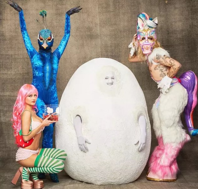 50 yaşındaki modelin eşi Tom Kaulitz de tavus kuşu yumurtası olarak yanında yer aldı.
