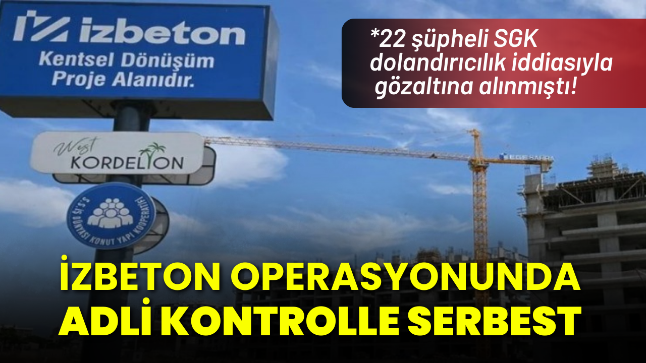 İzmir Büyükşehir Belediyesi iştiraki olan İZBETON'a yönelik düzenlenen operasyonda gözaltına alınan 22 şüpheli, sevk edildiği nöbetçi sulh ceza hakimliğinde yurt dışı yasağı konularak adli kontrol şartıyla serbest bırakıldı.