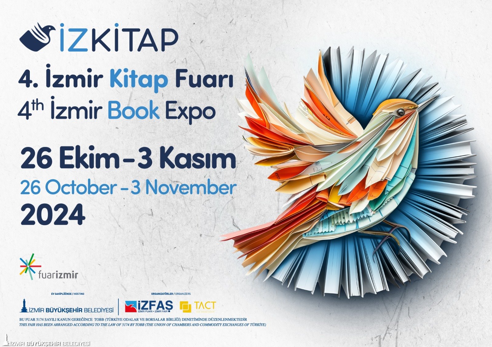 İZKİTAP – 4. İzmir Kitap Fuarı, İzmir Büyükşehir Belediyesi ev sahipliğinde İZFAŞ ve TACT Fuarcılık iş birliği ile Fuar İzmir’de kitapseverlerle buluşuyor. 26 Ekim günü kapılarını açacak İZKİTAP’ta söyleşiler, imza etkinlikleri düzenlenirken yüzlerce yazar, çizer, gazeteci, akademisyen okurlarıyla buluşacak. Fuarın temasına özel birçok söyleşi de yazar, oyuncu, gazeteci, düşünür ve akademisyenlerin katılımıyla gerçekleştirilecek. Girişin ücretsiz olacağı, 200’e yakın yayınevi, sahaflar ile sivil toplum kuruluşlarının katılacağı İZKİTAP, 10.00 ile 19.00 saatleri arasında ziyaret edilebilecek. İZKİTAP, ziyaretçileri için tam bir kültür şölenine dönüşecek. Sivil toplum kuruluşları ve bu kuruluşlar bünyesinde yer alan yazarlar da İzmirli kitapseverlerle buluşacak. Temanın “Sinema ve Edebiyat” olarak belirlendiği İZKİTAP’ta birbirinden değerli isimlerin katılacağı farklı konularda edebiyat ve sinema söyleşileri, şiir dinletileri, yazar ve okur buluşmaları, film gösterimleri gerçekleştirilecek.